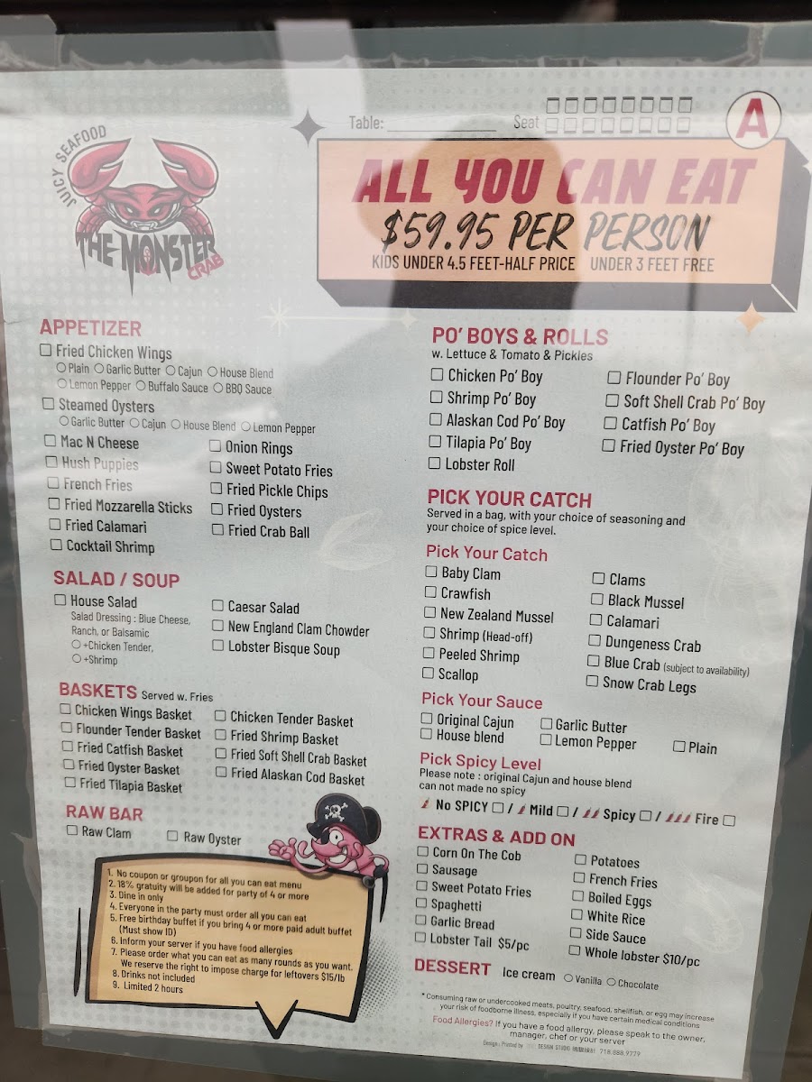Welcome to The Monster Crab all you can eat seafood & Bar, a vibrant seafood haven located in Bayside, NY. Prepare for a culinary adventure that celebrates the ocean's bounty with an all-you-can-eat experience that will leave you thoroughly satisfied.